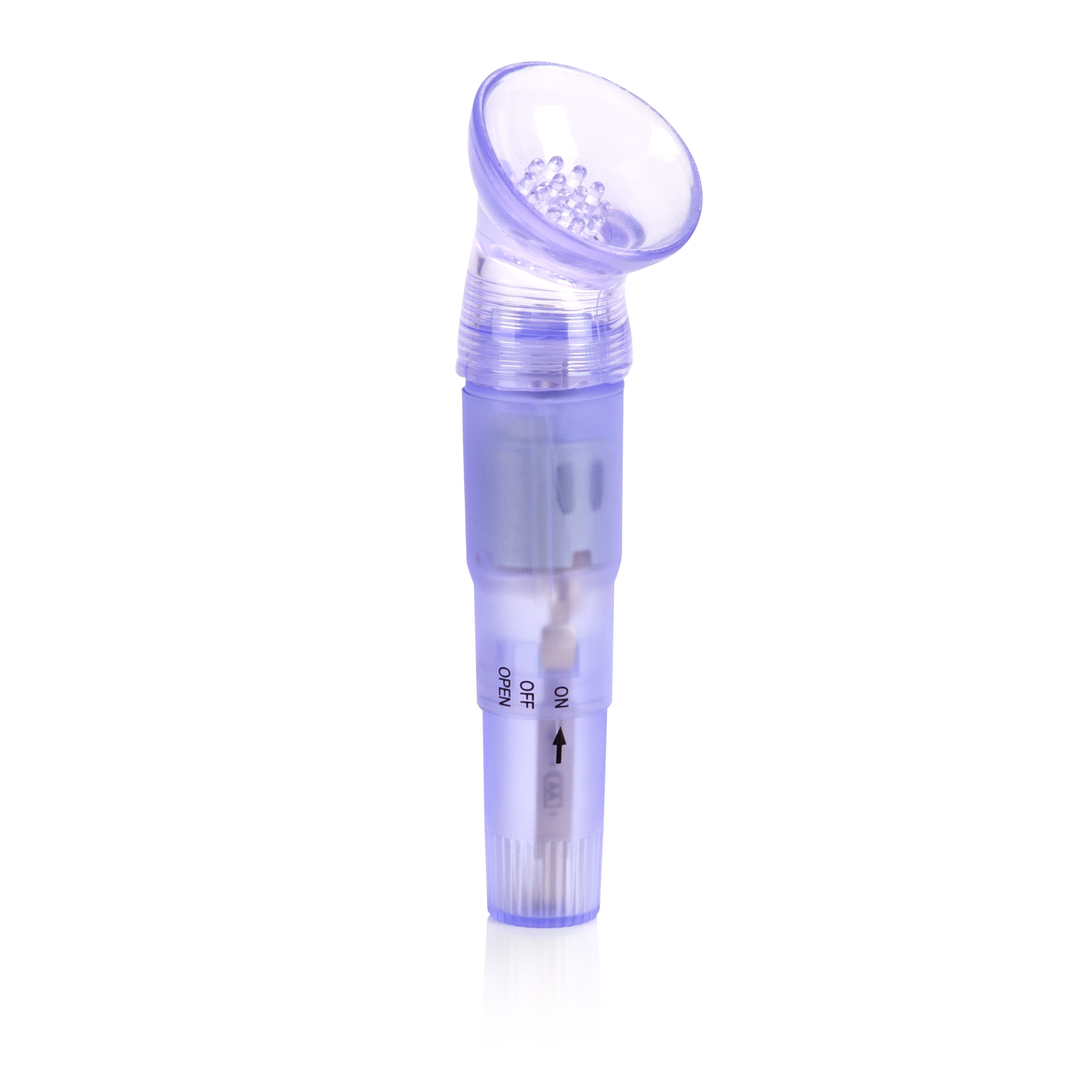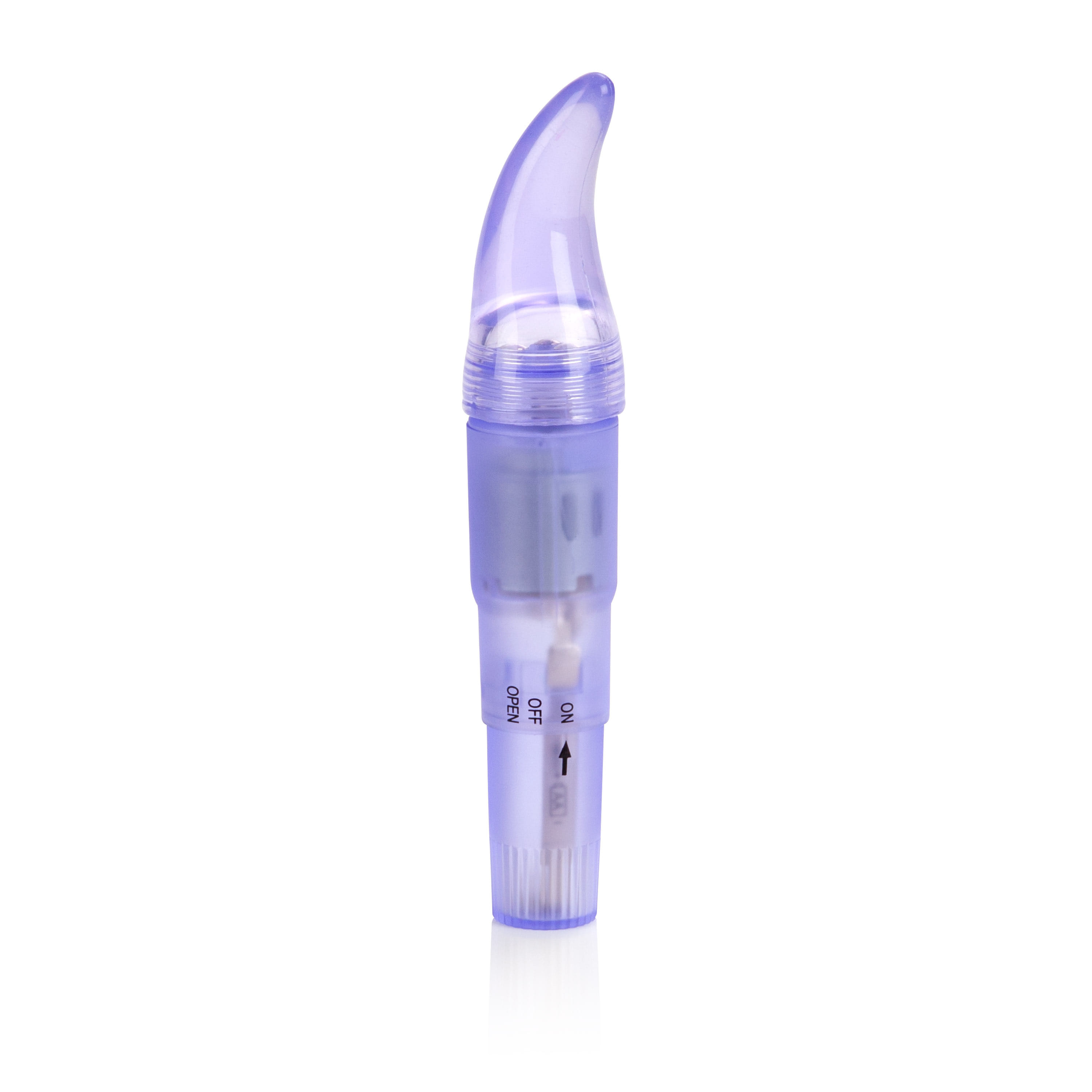 Discreet and powerful lighted pocket massager. 3 interchangeable pleasure tips. This item has one speed. Twist the base to switch on or off, and to open for